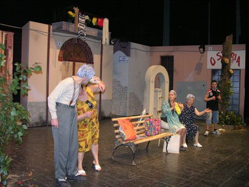 Piedro interrompe l’animata discussione. Piedro (Mauro Rosati) interrompe l’animata discussione tra sua figlia Ombretta (Maria Giannetta Grizi) il nipote Filippo (Leonardo Fava) Adele (Laura Pigliapoco) e Nunziada (Oriana Bolletta).